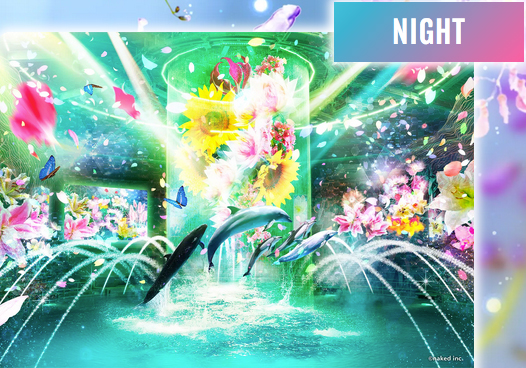 光・花・水のアートとイルカたちの共演が、会場全体に喜びあふれる