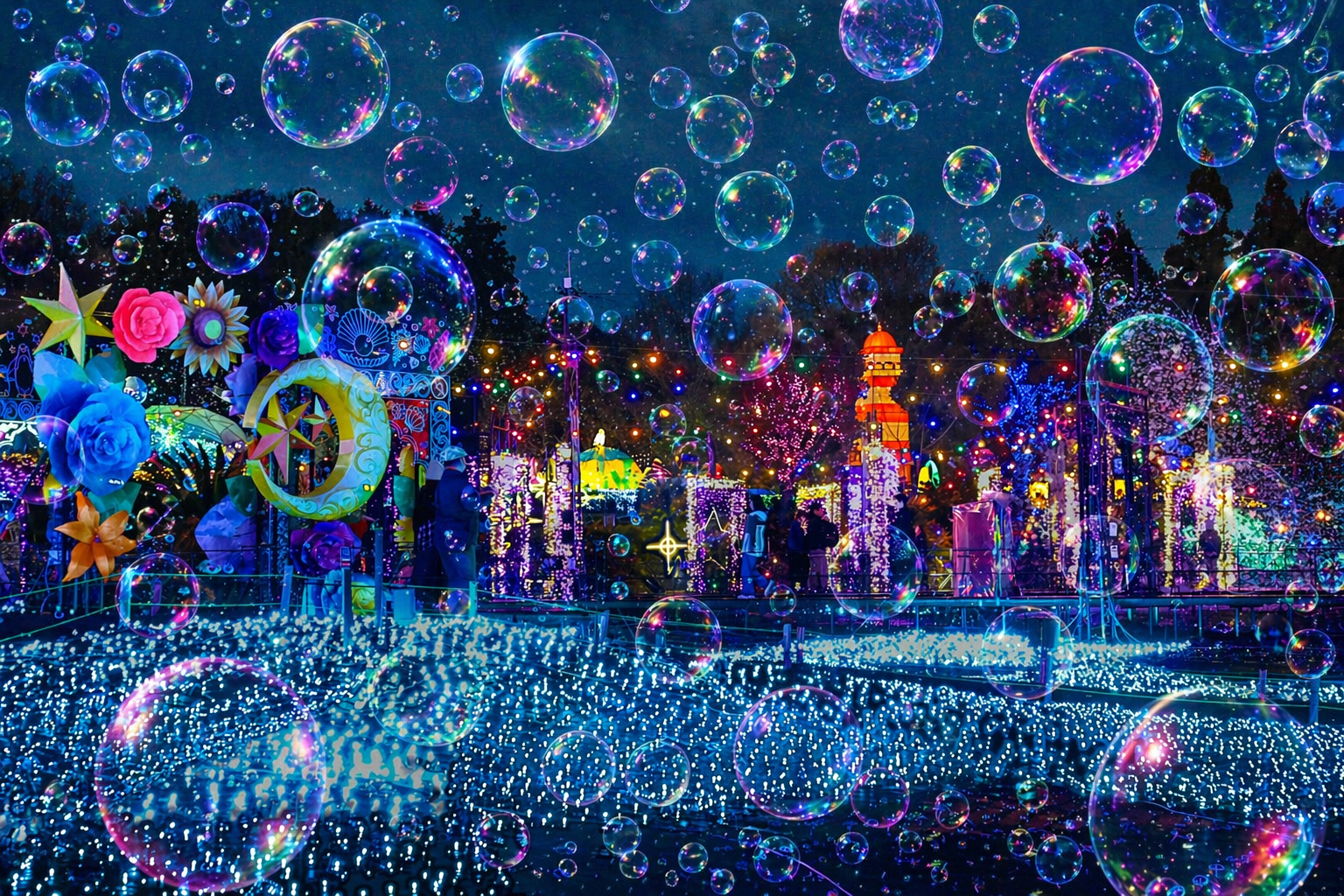 イルミエリアの各所に設置された装置から無数のシャボン玉が生み出され、音楽に乗って宙を乱舞する必見のショータイム!